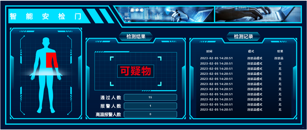 4、携带了铜制铝制管类等危险品,设备报警,人形显示报警区位并以图片提示报警危险品类别。同时与报警人的截图及身份认证信息自动上传到数据库或上传到甲方指定平台。记录报警人员的基本信息,通过时间,报警物品类别等信息。