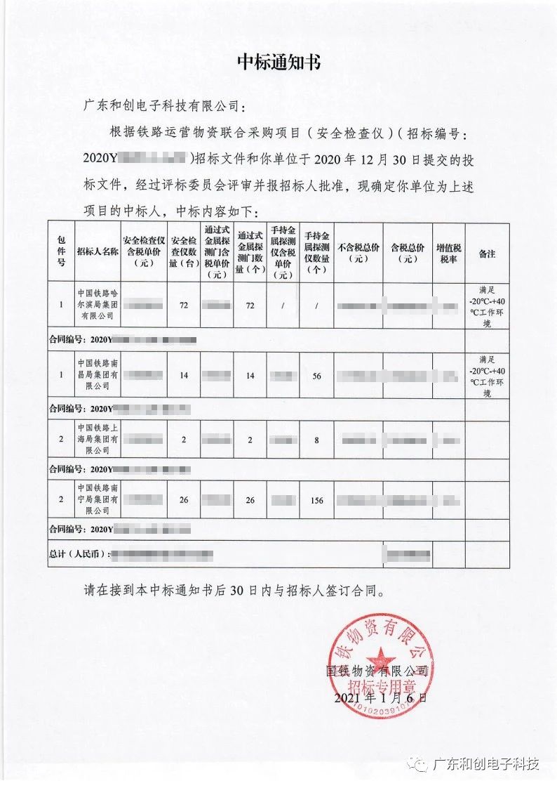 国家铁路集团总公司,公开招标铁路安全检查仪,在经过激烈的竞争之后,博鱼网页版凭借良好的产品质量和优异的服务质量中标此次采购项目。中标安全检查设备,包括:“X光行李安检机、金属探测门、手持金属探测仪”。今后的一段时间和创电子需要为中铁哈尔滨局、南昌局、上海局和南宁局这四家铁路局提供中标通知书中所提到的所有安全检查仪。